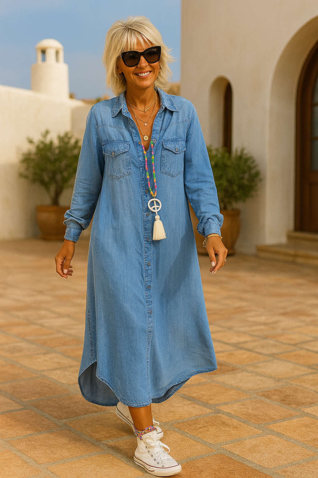 El vestido largo de manga larga Carmen combina el estilo atemporal del denim con un toque de elegancia moderna. Confeccionado en un tejido vaquero suave pero resistente, ofrece una sensación cómoda al llevarlo y al mismo tiempo aporta un look estilizado y relajado. Gracias a sus mangas largas y su corte maxi, es ideal tanto para el día a día como para ocasiones más especiales.