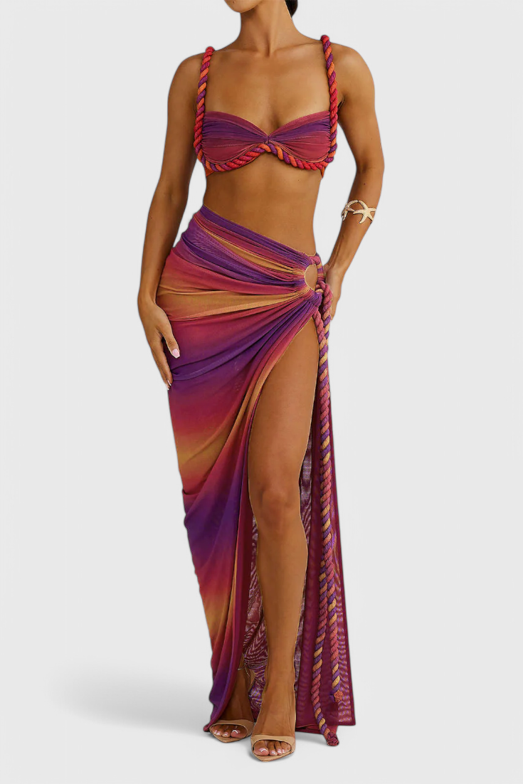 Vibrante y llamativo, este conjunto de falda está diseñado para destacar con su suave chiffon plisado, delicado bordado y soñados tonos en degradado. Ofrece una sensación ligera y aireada que se mueve maravillosamente contigo. Perfecto para salidas de primavera, vacaciones o eventos bajo el sol.