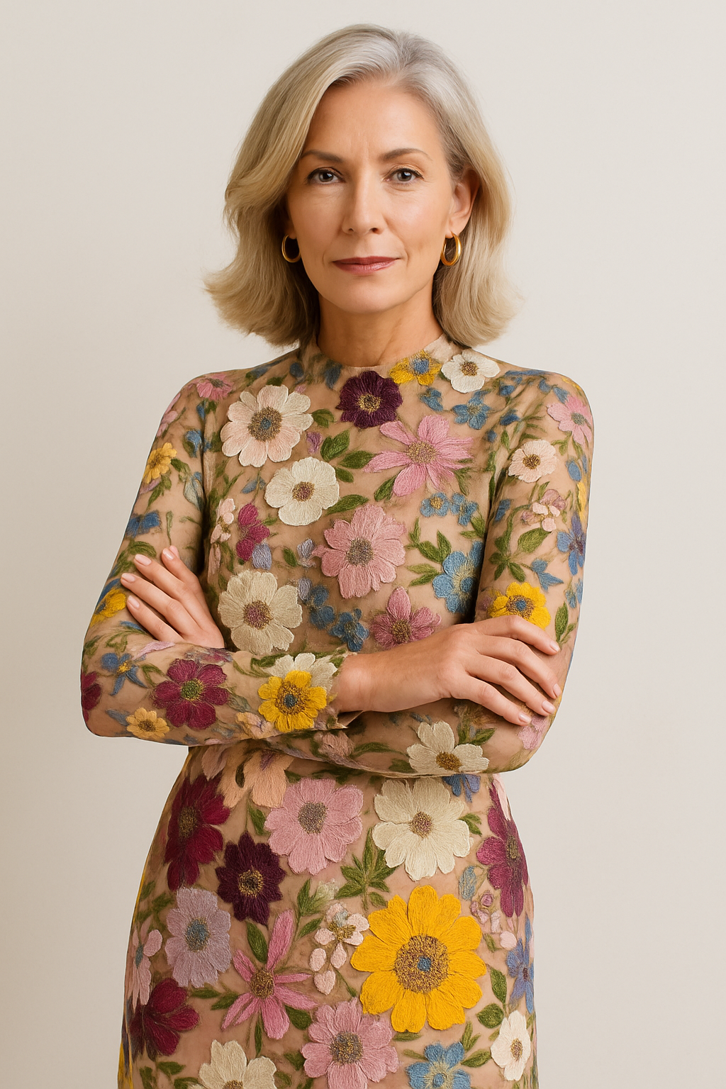 Sin mangas y con un cuello alto elegante, está confeccionado en un tejido ligero y adornado con un delicado bordado floral 3D que lo convierte en una auténtica joya. Con forro completo, cremallera oculta y un botón discreto en la espalda, este vestido combina comodidad y sofisticación en cada detalle.